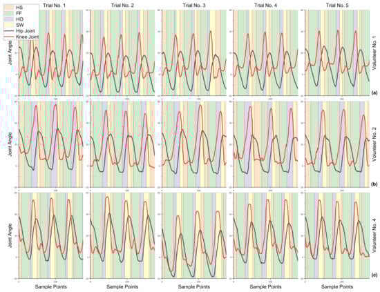 The data processing results of volunteer No. 1, No.2 and No.4. (a) are the five trials joints angle data from volunteer No. 1. (b) are the five trials joints angle data from volunteer No. 2. (c) are the five trials joints angle data from volunteer No. 4. The Red line represent the angle of hip joint, the black line represents the angle of knee joint. The pink, green, purple, yellow rectangle represents the gait phase of HS, FF, HO and SW respectively.