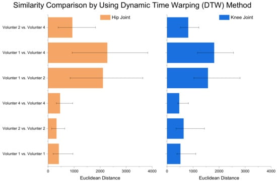 The joint angle curves similarity comparison results of volunteer No. 1, No. 2 and No. 4 by using dynamic time warping method. Each volunteer has similar joint curve shown in Volunteer No. 1 vs. Volunteer No. 1, Volunteer No. 2 vs. Volunteer No. 2 and Volunteer No. 4 vs. Volunteer No. 4. Different volunteers have different joint curves obviously, shown in Volunteer No. 1 vs. Volunteer No. 2, Volunteer No. 1 vs. Volunteer No. 4 and Volunteer No. 2 vs. Volunteer No. 4. The orange bar represent the Euclidean Distance of hip joint angle curves. The blue bar represent the Euclidean Distance of knee joint angle curves. The Matlab ’dtw’ command is used to obtain these results.