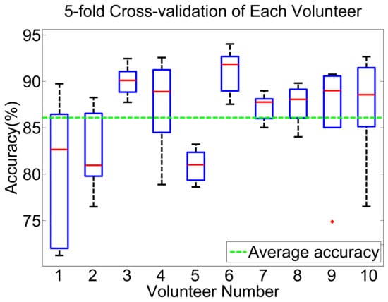 The classification results of each volunteer are shown in Figure 7. In this figure, the volunteers No. 3, 4, 6, 7, 8, 9 and 10 have an CR over  and the distribution of 5-fold cross-validation results is concentrated over the average line. This suggests that the data of these volunteers have less variation and have more consistency. The results of No. 1 and 2 are more variation than the other volunteers. However, the maximum CR is near , which means that the gait feature of some trial could be accurately obtained from other trials but the data of some trials do not contain enough gait features.