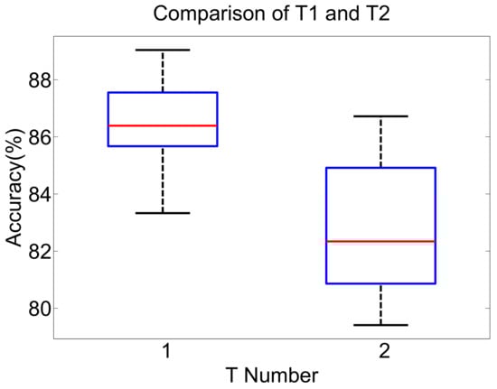 The box figure of comparison of T1 and T2. Both T1 and T2 are repeated 35 times.