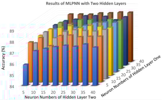 Regarding MLPNN networks, we use two hidden layers. In order to obtain reliable results, we train each MLPNN model for 10 times and calculate the average accuracy to represent the performance of that model. The number of the hidden layer nodes ranges from 5 to 40 in this model with 5 strides. The activation function is sigmoid and the maximum number of iterations is set to 1000. The results are shown in Figure 10 that shows different combinations of the number of hidden layers’ nodes. When the first hidden layer has 5 nodes and the number of nodes in the second one ranges from 5 to 40, the CR is always lower than 88%. When the number of nodes ranges from 10 to 25 in the first hidden layer and from 5 to 35 in the second one, the accuracy increases as the number of neurons increases and is almost always higher than 88% and achieves the best performance (88.45%) when the first hidden layer has 25 nodes and the second one has 35.