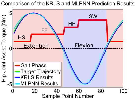 The results of assist torque prediction are shown in Table 10. The MSE of KRLS is two times smaller than MLPNN. These results show that the KRLS algorithm which has adaptive ability could predict the results quite well, even if there are unlearned unique gait features in the test set. Figure 11 shows a picked period of prediction results, in which we can find that the prediction results of MLPNN have an obvious lag and the results from KRLS basically coincide with the target assist torque trajectory.