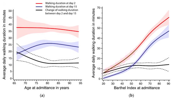 The evaluation of the nonlinear association of age and Barthel Index with walking duration is presented in Figure 1. Below the age of 80 years, age was negatively associated with walking duration improvement (Figure 1a). This was mainly due to lower activity levels at admission. In contrast, older patients had a similar improvement of about 10 min between day 2 and day 15. The average activity level at day 15 was similar for all age groups.