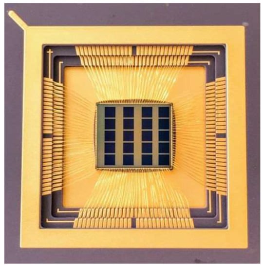 A QIS prototype chip fabricated by TSMC in a modified 45/65 nm stacked backside-illuminated (BSI) CIS process [] is shown in Figure 1, which contains twenty different 1Mjot QIS arrays. (A jot is a specialized pixel with a low full-well capacity and high conversion gain.) Figure 2 depicts the schematic of the readout chain. A two-way shared readout is implemented in the devices. The incident photons are absorbed by the photodiode and generate corresponding photoelectrons. The storage well (SW) collects the photoelectrons. During the charge transfer, the photoelectrons will be transferred to the floating diffusion (FD), thereby changing its potential, which is then read out by the in-jot SF. The jot output from the pixel wafer will be sent to the ASIC wafer through inter-die connections. A CDS circuit with two storage capacitors is implemented after the SF to process the jot signal. The samples in the CDS units are selected by a multiplexer and connected to a unity-gain buffer. The output of the unity-gain buffer is then connected to a PGA, where the signal is amplified with switchable analog gain that ranges from 2 V/V to 40 V/V. The output of the PGA is then sent to another unity-gain buffer, which drives the output pads so the signal can be readout off-chip. An off-chip 14-bit ADC is used to quantize the signal.