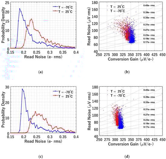 Figure 4 and Figure 5 show the results from the photon-counting histogram (PCH) testing using the timing diagram of Figure 3a. The PCH of each jot (actually two binned jots which share the readout) was created by repeatedly integrating and reading out the jot for 20,000 samples. The read noise and conversion gain (CG) were then extracted using the valley-to-peak modulation (VPM) method []. Figure 4 shows the read noise histograms for jots with BC014 SF and BC018 SF at room temperature and −70 °C. The noise is notably smaller at −70 °C, as shown in Figure 4a. The jots with BC014 SF show an average read noise of 0.26 e− rms with a best-case read noise of 0.19 e− rms at 25 °C, while the average read noise is 0.22 e− rms with a best-case of 0.17 e− rms at −70 °C. The reduction of the read noise at low temperature is mainly due to the reduction of 1/f noise []. As depicted in Figure 4b, a scatter plot of the voltage-referred read noise versus CG at 25 °C and −70 °C is presented. Dash lines are used to mark the noise in electrons, from which the minimum noise 0.17 e− rms at −70 °C is clearly observed. The CG is higher at low temperature, i.e., 352 μV/e− on average at −70 °C versus 340 μV/e− at 25 °C, likely due to the increase of SF gain as a result of mobility increase thus transconductance increase []. The increase of SF gain will reduce the Miller capacitance at the FD node due to gate-source overlap, hence the measured CG is higher at −70 °C. However, the read noise reduction at lower temperatures is not only due to increasing CG, but also SF noise reduction, since CG increases ~4% but input-referred read noise decreases ~15%. Figure 4c,d show the experimental data for jots with BC018 SF. Similar read noise scaling trend with temperature is observed.