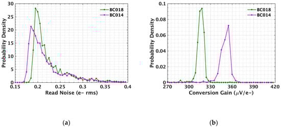 (a) A histogram of the read noise of the jots (256 × 8) with BC018 SF and BC014 SF at −70 °C; (b) a histogram of the conversion gain of the jots with BC018 SF and BC014 SF at −70 °C.