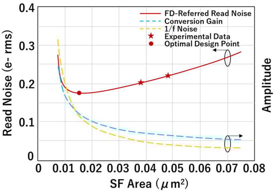 A comparison is made between the BC014 SF and BC018 SF at −70 °C, as illustrated in Figure 5. Figure 5a shows that BC014 SF has lower noise than BC018 SF. Although BC014 SF has a smaller gate area thus higher 1/f noise [], its CG is higher compared to BC018 SF due to the smaller gate capacitance as shown in Figure 5b. The high conversion gain factor leads to lower FD-referred noise in the end. Figure 6 shows this tradeoff between 1/f noise and CG with SF area scaling. The FD-referred 1/f noise can be written as