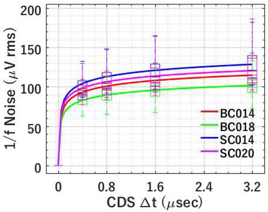 According to previously introduced models, 1/f noise is dependent on CDS Δt. Figure 8 shows the comparison between the modelled and experimental data for four types of SFs. The measured noise is presented using boxplots, while the modelled noise trend, based on the measured average noise, is shown using solid curves. As shown in Figure 8, the modelling of 1/f noise versus CDS Δt characteristics matches the experimental data excellently. 1/f noise can be effectively suppressed by decreasing CDS ∆t. Specifically, 1/f noise at five different CDS ∆t, i.e., 0, 0.4, 0.8, 1.6, and 3.2 μs was measured. All four types of SFs show decreasing 1/f noise at smaller CDS ∆t, which is consistent with [,].