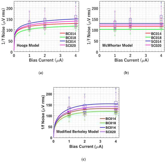 Overall, none of the models can be readily fitted with the experimental data in the bias current testing. Both the Hooge mobility fluctuation-based model and the modified Berkeley model show a stronger bias current dependence than the measurement does. However, after introducing the log fitting model, the modelling can fit the experimental data reasonably well as depicted in Figure 9a,c.