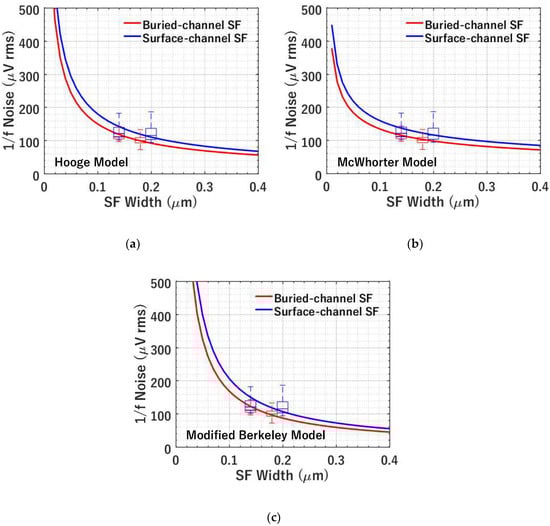 Figure 10 depicts the noise trend with the SF dimension for different types of conduction channels, i.e., buried channel and surface channel. The average η of BC014 and BC018 is used for modelling the 1/f noise versus SF width characteristics for buried-channel SF. Similarly, the average η of SC014 and SC020 is used for 1/f noise modelling of surface-channel SF. As shown in Figure 10a, the modelling using the Hooge mobility fluctuation-based model matches the experimental data reasonably. 1/f noise is higher for smaller devices, which agrees with previous findings []. Buried-channel SFs have lower noise than surface-channel SFs, which is likely due to less scattering.