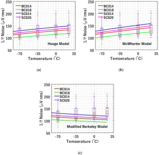 Modelled (using average noise) and measured 1/f noise versus temperature for 4 types of SFs at Ib = 1 μA and CDS Δt = 3.2 μs for 4 types of SFs. (a) Hooge mobility fluctuation-based 1/f noise model versus experiment; (b) McWhorter number fluctuation-based 1/f noise model versus experiment; (c) modified Berkeley 1/f noise model versus experiment. The measured data is shown using box plots and the simulated data is shown by solid lines.