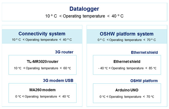 Figure 2 shows the configuration of the entire monitoring system by focusing on operating temperatures. Of the numerous options to connect the Open Source Hardware (OSHW) platform to the Internet using 3G, the TL-MR3020 router from TP-LINK was selected given its potential to configure Wi-Fi and 3G transmission systems at a low price. This device requires an external 5VDC/1A power supply and the temperature range operates from 10 °C to 60 °C with relative humidity conditions within a range from 10% relative humidity (RH) to 90% RH (non-condensing). As the router has an on-board interface USB 2.0 port, the 3G operating mode was configured by providing an Internet connection via a 3G USB stick modem. For this purpose, the MA260 modem from TP-LINK was selected. The USB modem operating temperature range was 0–40 °C. Thus, the operating temperature of the entire system (router and modem) was limited by the most restricted values: 10–40 °C. The operating temperature of the connectivity system was the most limited.