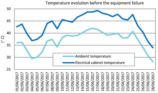 To test the design, an exhaustive study of the data collected in the month prior to the failure recorded in Linares on 28 June 2017 was conducted by paying special attention to the measured temperatures. Table 1 shows the minimum, maximum, and average values of the ambient temperature (Tamb)—the temperature inside the electrical cabinet (Tec) and the humidity (H) recorded in Linares from 1 June 2017 to 28 June 2017.