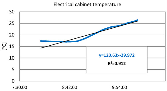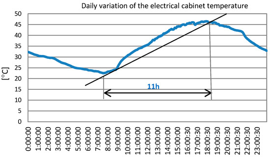 After studying the cycle of temperatures, the average duration of the cycle of the growing electrical cabinet temperature was 11 h (see Figure 5), which was taken as the exposure time selected for the test.