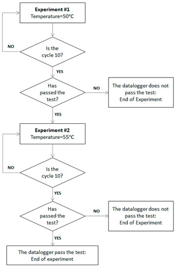 Table 3 shows the final values selected to run the temperature test. The maximum recorded rise was approximately 0.09 °C/min. Given the resolution of the employed chamber, the selected speed of temperature variation was 0.1 °C/min. Figure 6 shows the block diagram of the entire experiment, including Experiments #1 and #2. The process was composed of two experiments; each experiment comprised 10 cycles. The maximum temperature used in Experiment #1 was 50 °C; the maximum temperature raised in Experiment #2 was 55 °C. They were consecutive processes: To start Experiment #2, the datalogger had to first pass Experiment #1.