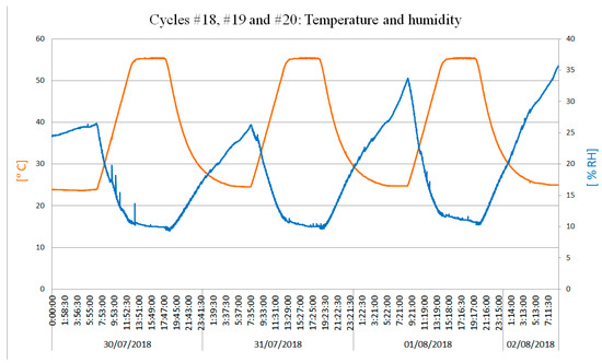 The rise period was programmed according to the worst case of the recorded gradients, and the maximum temperature was reached in approximately 5 h. Then, the cycle was extended to complete 11 h. When the maximum temperature was reached, the chamber was disconnected, the cycle’s relaxing time started, and the system was driven to ambient temperature.