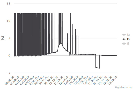 For the datalogger with 3G connectivity installed in Linares, the current sensor did not measure correctly. The sensor’s measurement was correct, but some peaks often appeared, as shown in Figure 10. Both sensors (humidity and current sensors) were replaced. As the system was designed using low-cost sensors, replacing damaged sensors had no economic impact.