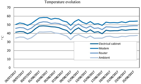 Due to the change in platform (that implies a change of processor, as shown in Table 6), the optimized datalogger was installed in Linares, Jaén, Spain (latitude N 38.085°, longitude W 3.646°), to study the behavior of the system under harsh environmental conditions. The datalogger measured ambient temperature, modem temperature, and router temperature (digital Dallas sensors). Every 30 s, these parameters were sent to a server located in Jaén and tothe cloud.