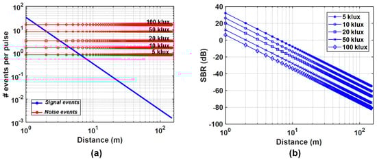 Simulation results of (a) the number of events per pixel per laser pulse at different background noise levels and (b) the SBR for 1–150 m target distances, d.