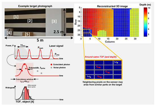 The main idea is to exploit the fact that the signal photons reflected from the target are temporally correlated and thus, most likely to be concentrated within a time-window coarsely equal to the total system full width at half maximum, , where is as defined in Equation (2). Instead of letting the sensor integrate events over the entire measurement window, , imposing this time constraint, referred to as the “coincidence window”, reduces the likelihood of acquiring noise events whose probability of occurence within that window is very low, thus, electrically enhancing the SBR. Coincidence may be implemented at the sensor level over clusters/groups of closely-spaced pixels, exploiting a “more-likely” fact that neighboring pixels may belong to similar target depths (and thus, TOFs), as depicted in Figure 6 for the object labelled [4].