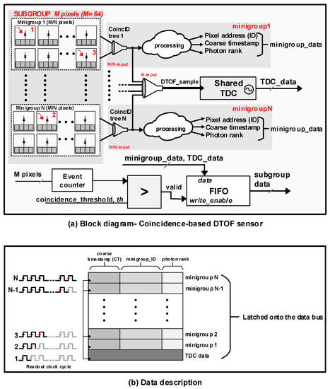 (a) A block diagram of a DTOF sensor adapted to detect coincidence and (b) description of data from subgroup, that is, minigroups and TDC data.