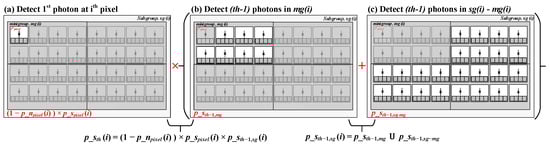 The probability of detecting valid signal events within can be calculated as a conditional probability of detecting a signal event in a pixel, i, given that no noise photon is detected at i and signal events are detected in the rest of the subgroup (see Figure 9 showing combined probability).