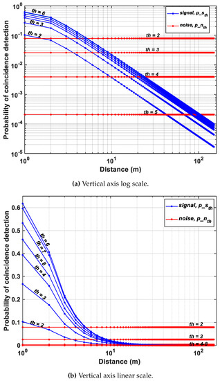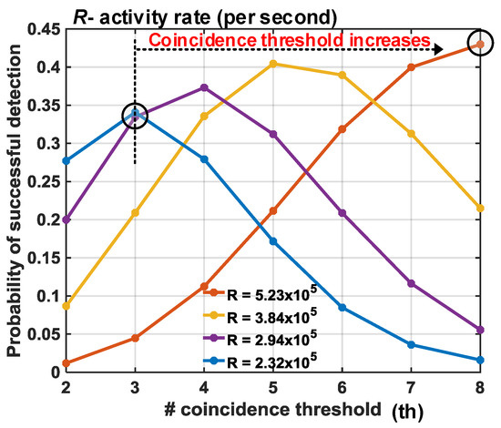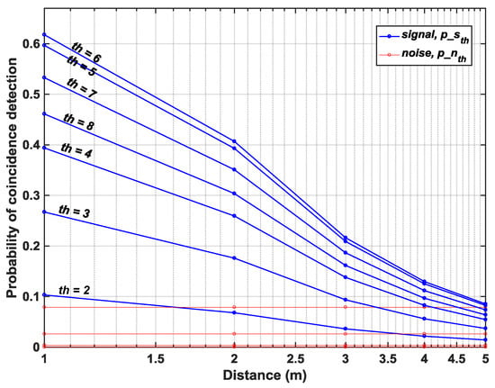 Figure 16 in fact shows how coincidence threshold, , increases for increasing photon activity, R, to provide a successful detection (temporal error, ps), implying that a single threshold cannot yield an accurate reconstruction of a scene and a higher (lower) reflective target will imply higher (lower) photon activity rate requiring higher (lower) coincidence thresholds. On revisiting Figure 10b (redrawn for clarity in Figure 17), this relationship is already evident there. For targets at distances, particularly at m, where the number of returning photons is higher, the probability of signal detection increases for increasing thresholds, (see Figure 17). However, the probability ceases to rise for thresholds where the number of photons within the coincidence window is lesser than the threshold itself (see ), given the fact that coincidence detection is performed utilizing photons within the laser pulse.