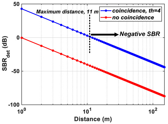 For the Flash LiDAR scenario described in Section 2.1 and the proposed DTOF model in Section 3, the probabilities of noise and signal detections under coincidence mode are calculated for a flat target at increasing distances, d. The subgroup, , consists of 64 pixels (8 × 8 ) and the minigroup, consists of 4 pixels (2 × 2). Figure 10a,b, show the simulated results on a log and linear scale respectively under a 50 klux background light condition (see Appendix A for results with 100 klux background light for comparison). The probabilities have been plotted for coincidence thresholds, to with a ns. A direct comparison with Figure 5 shows that coincidence evidently increases the probability of signal detection, particularly seen for m (clearer visibility on linear scale in Figure 10b). While this is true, it can also be seen that for m, there is significant reduction in signal probability as well. The achieved SBR after detection, (dB) is plotted for the proposed architecture without and with coincidence, for in Figure 11. As seen earlier, the sensor operates in a negative SBR regime throughout the unambiguous range under no-coincidence. In addition, it can also be clearly seen that when the sensor is operated under coincidence, for longer ranges, d, the returning signal photons are also fewer (inverse square law) and imposing a timing constraint, , through coincidence does not provide any additional improvement in the SBR. In fact, under the wide-angle FOV flash scenario used in this simulation with 50 klux background noise, the maximum distance is 11 m up to which the the sensor still operates in a positive SBR regime. Beyond this point, the sensor enters the negative SBR region (see marking in Figure 11).