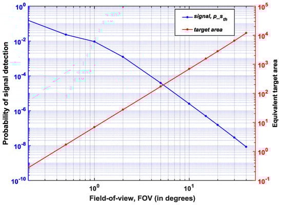 Figure 12 shows the simulation of alternative (2) mentioned above to detect signal at 150 m (maximum unambiguous range at =1 MHz) at . The probability of signal detection is plotted with varying FOVs; clearly it can be seen that the success of detection improves with decreasing FOVs as expected and in this example, reaching peak at 0.2 FOV. Also, considering a practical scenario, at distances about 50–150 m, it is sufficient to get the range estimation alone and this can be achieved with a very narrow FOV. Figure 12 also shows that a lower FOV and thus, a smaller coverage area result in lower integrated background noise. This naturally improves the SBR and therefore, also the signal detection probability. Certainly, at 150 m, operating with a FOV of 40, covers an area of approximately 10,000 m, which is totally an impractical scenario. Therefore, for longer distances, the illumination unit may be used as a point source, using all the energy of the laser pulse to provide range estimation alone while for shorter distances, the laser energy may be distributed into a wider FOV with an array of points to provide 3D depth map.