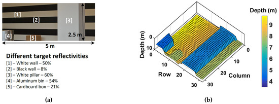 Labelled [1] is an object with 60% reflectivity (retro-reflective equivalent) at about 5 m and the desired target, labelled [2], situated at 20 m with 10% reflectivity. This target is reconstructed by the proposed DTOF model with 1024 pixels (32 × 32); the parts of this target as seen by different subgroups is highlighted in Figure 22b for ease of visualization. As numbered above, will be focused for this analysis; it covers a vast portion of the actual desired target (42 pixels) and a small fraction of the retro-reflective equivalent (17 pixels). The proposed DTOF model is simulated without and with gating.