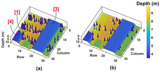 The coincidence-based DTOF model in Section 3.1 is proposed to mitigate the limitations in a first-in-win-all scheme evident with simulation results from the above plots. The measured image (Figure 13b) is then fed as a target to the proposed model under 5 klux background noise first and simulated. The subgroup, , consists of 64 pixels (8 × 8) as mentioned previously and the minigroup, (absent in the first-in-win-all scheme) consists of 4 pixels (2 × 2). The reconstructed 3D image from the proposed scheme is shown alongside in Figure 14b for direct comparison with the first-in-win-all (no-coincidence) architecture. As can be seen, coincidence significantly improves the depth measurement with much fewer incorrect samplings.