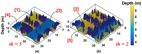 Following this, the measured image (Figure 13b) is then fed as a target to the proposed model under 50 klux background noise condition and with coincidence. The 3D image results from the simulations are shown in Figure 15, where it can be seen that there is an apparent threshold-selective pattern in the reconstructed 3D image. In Figure 15a, with , it can be seen that objects (1), (3) and (4) being more accurately reconstructed compared to rest of the scene owing to their higher reflectivities, while in Figure 15b, with , objects (2) and (5) take preference over the rest of the scene. This points to an important relationship between coincidence threshold, and the target reflectivities.