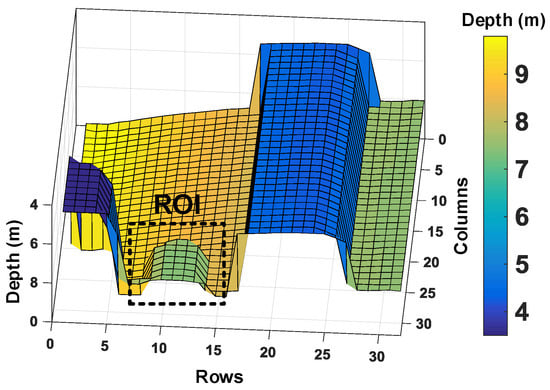 As can be seen through Figure 18a–c, a subgroup of 8 × 8 for coincidence and minigroup of 2 × 2 in Figure 18c allows improved 3D reconstruction (only about 7% incorrect sampling) by performing coincidence within a subgroup of 64 pixels (8 × 8). Additionally, the 16 minigroups containing 4 pixels (2 × 2) each enable up to 16 simultaneous TOF measurement within the coincidence window, . Another objective of enabling multiple timestamping through the minigroups is to reduce the timing uncertainty, which could otherwise be limited to . It can be understood better by looking at a particular region of interest (ROI) in the example target introduced. Figure 19 highlights the ROI in the target input for this analysis.