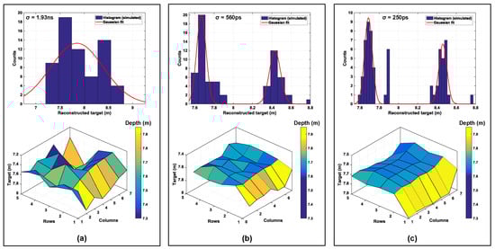 Absence of timing information on the contributing events within results in an averaging effect in the reconstructed image, with timing uncertainty . This may not be of concern for very narrow pulses (with small FWHM), however when pulses become wide (on the order of 2–5 ns), this uncertainty can result in depth error estimates. Figure 20a shows this effect where there is no mutliple event timstamping. As can be seen, the reconstructed 3D image has averaged out with respect to the actual target input (see ROI in Figure 19) with an uncertainty, ns and as seen in the corresponding histogram, the obtained Gaussian fit peaks around the mean value of 7.84 m, deviating from the actual input.