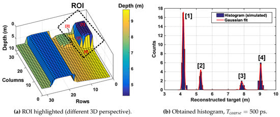 Figure 20b,c shows simulations with minigroup timestamping with a resolution of = 500 ps and = 200 ps respectively. The histogram in these cases shows two distinct peaks with a bin resolution given by . These peaks are then spatially correlated to the pixels in the minigroup from the generated in each minigroup (as described in Section 3.1). The improvement in timing uncertainty can also be seen in the corresponding 3D images below the histograms. In principle, it is possible to detect up to 16 distinct peaks (number of minigroups = 16) in this example scenario. Figure 21 shows another histogram simulation result on a different ROI, as marked in Figure 21a. As labelled, there are 4 distinct parts in this ROI which are seen as 4 distinguishable peaks on the histogram.