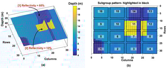 The proposed DTOF sensor is modeled to optionally operate in a time-gating mode to address scenarios such as this. Every subgroup, , is modeled to have unique gating windows. A different example target scene, shown in Figure 22a is used as an input to analyze this condition and fed to the proposed DTOF model, now operating under time-gating mode. The number of pixels in the subgroup is assumed to be 8 × 8 with 16 minigroups, each consisting 4 pixels (2 × 2).