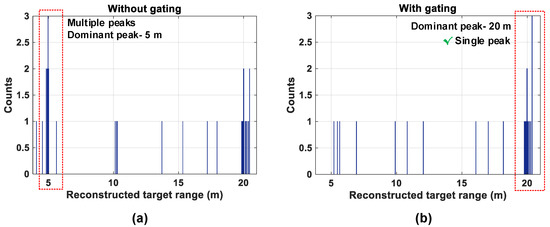 The average photon rate from object (1) is much higher than object (2) and therefore, the subgroup combination tree will propagate more events from object (1) compared to object (2) for a given measurement time, which can potentially mask the desired target photons from a target which may reflect fewer photons (as object (2) in this example). Without gating results in a histogram with two peaks, with a dominant one at 5 m as seen in Figure 23a and another peak at 20 m. In fact, if a desired target was situated at a much longer distance, it may potentially not be possible to recover photons back from this target. Consequently, the presence of a dominant peak from the retro-reflective equivalent in the acquired histogram may mask the presence of the farther target. While the dominant peak from the retro-reflective target is not wrong, the low probability of recovering the farther target peak is of important concern.