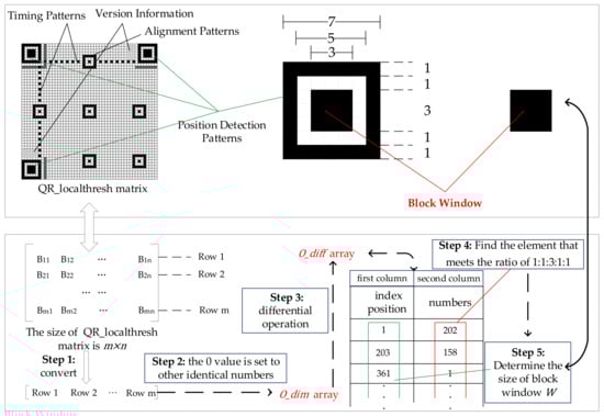 - Find the element that meets the ratio of based on the last column data of , then calculate the size of the dark module in the middle of the position detection pattern by the index position corresponding to the element in the first column data. Namely, the index position difference corresponding to the proportional value 3 is equal to the side length of the dark module. Accordingly, the algorithm selects the size of the block window to be adaptively.