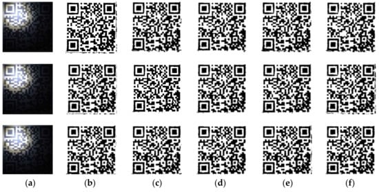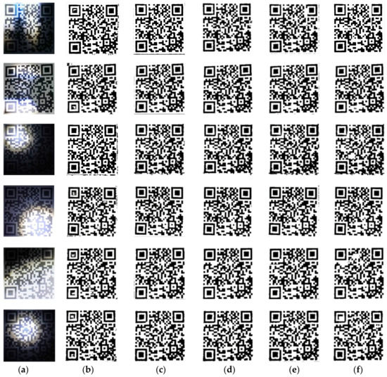 - The effect of different algorithms in dealing with uneven QR codes with strong light spots is shown in Figure 12. The local light intensity is too loud when the image is collected, and the acquisition device has a focus on this area, which has led to this kind of phenomenon of uneven illumination.