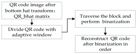 - All the blocks are traversed, and each block is binarized by the Otsu’s method. However, it was found in the experiment that the image information at the first block location sometimes disappears. Through analysis, we found that the first block image contains an indefinite foreground and background after enhancing the contrast of the uneven illumination of the QR code. Therefore, the Otsu’s algorithm cannot obtain a better binarization effect after processing the image. The defect can be eliminated when the cyclic threshold algorithm processes the first block. The schematic diagram is shown in Figure 9.