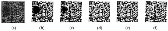 - The effect of different algorithms to deal with the uneven illumination of the QR code with higher overall contrast is shown in Figure 13. The cause of uneven illumination is that the image is obscured, which results in partial shadows on the image.