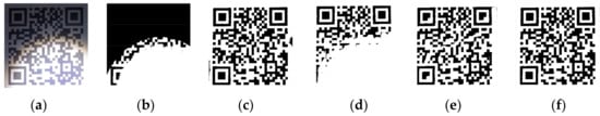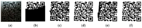 - The effect of different algorithms to deal with the uneven illumination of the QR code with lower local contrast is shown in Figure 14. This phenomenon occurs when the local illumination is too intense.