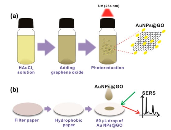 Schematic representation of the fabrication process for h-paper-based surface-enhanced Raman scattering (SERS) sensor. (a) Photoreduction process for the synthesis of AuNPs arranged on GO flakes (AuNPs@GO). Under UV irradiation, AuCl4− ion was reduced to Au0 on the surface of the GO. (b) The h-paper-based SERS substrate was fabricated by drop-casting 50 µL AuNPs@GO solution onto the h-paper.