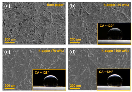Figure 2 shows the SEM images of the filter paper coated with diluted PDMS at 0, 40, 70, and 100 wt%. With the increase of the PDMS weight fraction, the fibrous nature of the filter paper gradually disappeared. It is worth noting that in our previous study, the PDMS-coated paper provided moisture-resistant properties [29]. The insets in Figure 2 show the optical microscopic images of water droplets for contact angle measurements. For the bare filter paper, the water droplet was momently absorbed into the paper, and the contact angle could not be measured. The contact angle of the h-paper with 40 wt% PDMS was about 130.6° ± 1.7°. The contact angle of the h-paper slightly decreased with a further increase of the PDMS weight fraction, as shown in Figure S1 of the Supplementary Information. The contact angle of the h-paper with 70 wt% and 100 wt% were about 128.4° ± 2.1° and 124.2° ± 3.3°, respectively. Even though the water contact angles slightly decreased, they still confirmed the hydrophobic surface property. The h-paper with 40 wt% PDMS was used as the hydrophobic substrate in subsequent studies owing to its adequate hydrophobic property.
