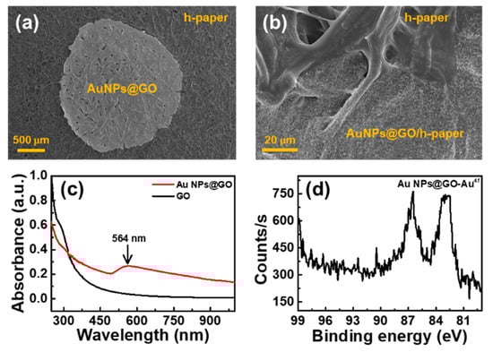 SEM images of the h-paper-based SERS substrate. (a,b) 50 µL of AuNPs@GO solution was drop-casted and dried on the h-paper substrate. The area of the AuNPs@GO spot was about 4.2 mm2. (c) UV-Vis spectra of GO and AuNPs@GO. For the AuNPs@GO dispersion (red), a broad peak appeared at around 564 nm, unlike the GO dispersion (black), owing to the localized surface plasmon resonances of AuNPs synthesized on the surfaces of GO. (d) X-ray photoelectron spectroscopy (XPS) spectrum of the Au4f peak recorded for AuNPs@GO, indicating that AuNPs were successfully arranged on the surfaces of GO.