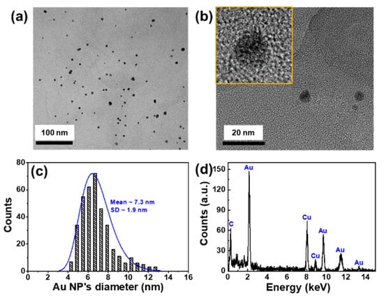 Figure 4 shows the morphological and chemical compositions of the AuNPs@GO. From the TEM images shown in Figure 4a,b, the AuNPs were dispersed well on the surfaces of the GO flakes. The average diameter and standard deviation of the AuNPs was about 7.3 nm and 1.9 nm, respectively, as shown in Figure 4c. The particle distribution of the AuNPs was obtained from eight regions of interest and 370 particles using ImageJ software, as shown in Figure S2 of the Supplementary Information [28]. Figure 4d shows the EDS spectrum of the AuNPs@GO. The Au characteristic peaks were also observed.