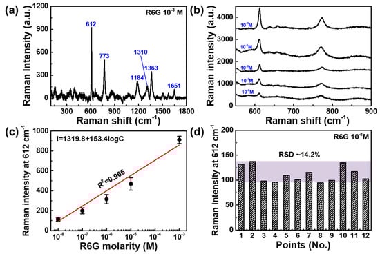 SERS spectra for R6G absorbed on the AuNPs@GO/h-paper. (a) R6G spectra with a concentration of 10−3 M exhibited a strong peak of the vibrational bands at about 612, 773, 1134, 1310, 1363, and 1651 cm−1. (b) SERS spectra of R6G molecules with concentrations in the range from 10−3 to 10−8 M. (c) Raman intensity at 612 cm−1 as a function of the logarithmic concentration of the R6G molecule. (d) Raman intensity at 612 cm−1 from 12 randomly selected spots. The relative standard deviation was about 14.2%.