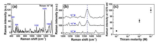 SERS spectra for thiram absorbed on the AuNPs@GO/h-paper. (a) Raman spectrum of thiram molecules with concentration of 10−3 M exhibited a strong peak of the vibrational bands at about 441, 554, 1132, 1370, and 1505 cm−1. (b) SERS spectra of thiram molecules with concentrations in the range from 10−3 to 10−6 M. (c) Raman intensity at 1370 cm−1 as a function of logarithmic concentration of thiram molecules.