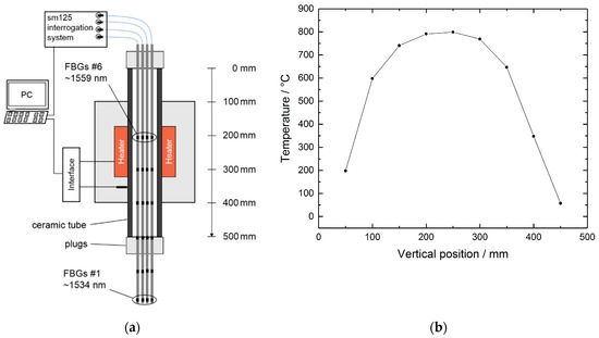 Figure 1 shows a schematic of the FBG sensor array. Over a length of 600 mm, the acrylate coating of an H2-loaded (180 bar, 2 weeks, 25 °C), standard single-mode fiber SMF28 was removed, and six seed FBGs were inscribed with a KrF Excimer laser (MLI-200, MLase AG, Germering, Germany) using the phase mask method. The FBGs had lengths of 2.6 mm and the positions of the FBGs were equally separated by 100 mm. The Bragg wavelengths of the seed gratings ranged from 1534 nm to 1559 nm (FBG #1 to #6, see Figure 2a and Figure 3b) and the spectral separations were about 5 nm, in order to avoid spectral overlapping, even if large temperature gradients between the FBG locations were present. A short piece of coreless fiber was spliced to the end of the sensor fiber to avoid disturbing interference effects caused by back-reflected light from the rear end of the fiber. Then, the sensor fiber was spliced to a standard SMF 28 fiber with an 1800-mm-long bare fiber segment. The acrylate coating was removed from the designated fiber sections, because it would burn at the temperatures expected there.