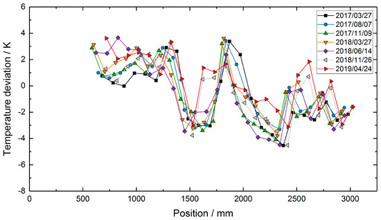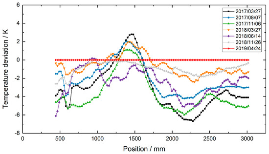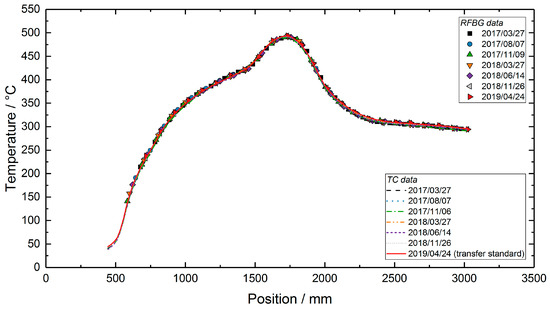 To assess the sensor performance in terms of temperature accuracy, the temperature profile measured with the TC transfer standard on 24 April 2019, was subtracted from the temperature profiles of the RFBG sensor system (see Figure 8). If there was no measuring point at the same position, the corresponding temperature of the single-point TC transfer standard was calculated by linear interpolation between two neighboring values. Figure 8 depicts the temperature deviations between the transfer standard and the RFBG data. Here, the differences were in the range of ±4 K. The deviations of ±4 K in the RFBG data are within the uncertainty of the RFBG calibration procedure (±4.5 K, see Section 2.3). In addition to that, a drift of the RFBG sensors or instabilities of the setup might also contribute to the observed differences.